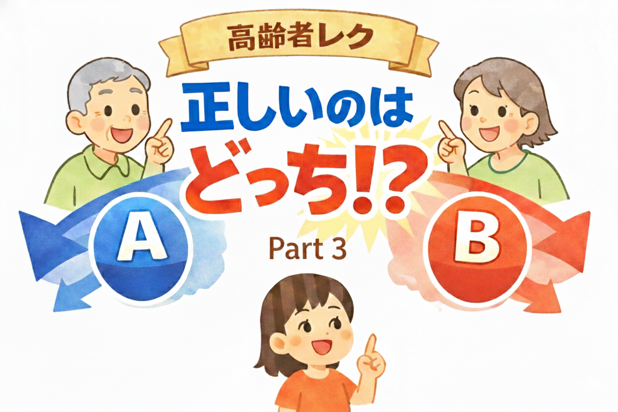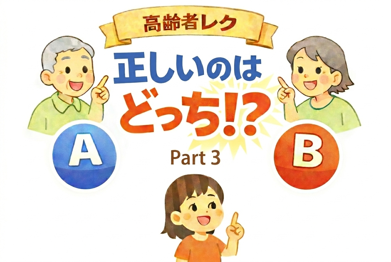 高齢者向けクイズレクリエーション「正しいのはどっち⁉️」を台本形式で紹介。デイサービスですぐ使えて会話が広がる、準備いらずの実践ネタ10問。