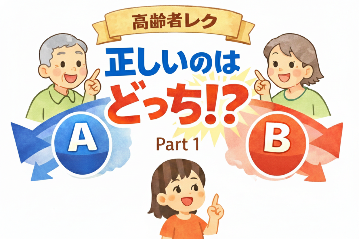 「正しいのはどっち⁉️」は、2択で答えるだけのシンプルなクイズですが、声かけや豆知識を加えることで10問で約30分楽しめるレクリエーションになります。
