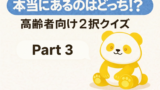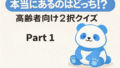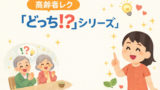 ✏️高齢者レクで使える「どっち⁉️」シリーズ一覧 Uncategorized X Facebook はてブ LINE Pinterest コピー 2025.12.222026.01.04 このページでは、デイサービス・高齢者レクリエーションの現場で実際に使っているクイズレク「大きいのはどっち⁉️」「本当にあるのはどっち⁉️」、通称「どっち⁉️シリーズ」を一覧としてまとめています。 このレクについて詳しく知りたい方は、こちらの記事をご覧ください。 📘 どっち⁉️シリーズまとめ 【大きいのはどっち⁉️】 大きいのはどっち⁉️ Part1 大きいのはどっち⁉️ Part2 大きいのはどっち⁉️ Part3 大きいのはどっち⁉️ Part4 大きいのはどっち⁉️ Part5 大きいのはどっち⁉️ 総集編 【本当にあるのはどっち⁉️】 本当にあるのはどっち⁉️ Part1 本当にあるのはどっち⁉️ Part2 本当にあるのはどっち⁉️ Part3 本当にあるのはどっち⁉️ Part4 本当にあるのはどっち⁉️ Part5 本当にあるのはどっち⁉️ 総集編 【正しいのはどっち⁉️】 正しいのはどっち⁉️ Part1 👉 どっち⁉️シリーズ一覧 いろいろなレクリエーション事例を知りたい方は、こちらの記事をご覧ください。 各季節の「こども俳句穴うめクイズ」については、こちらの記事をご覧ください。